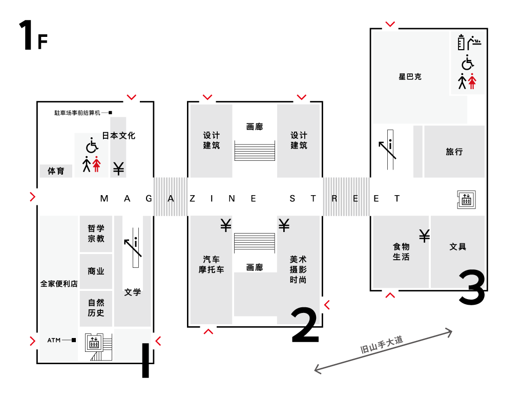 茑屋书店部分由三座建筑物连贯构成,横亘其中的杂志大道(Magazine Street)全长55米,