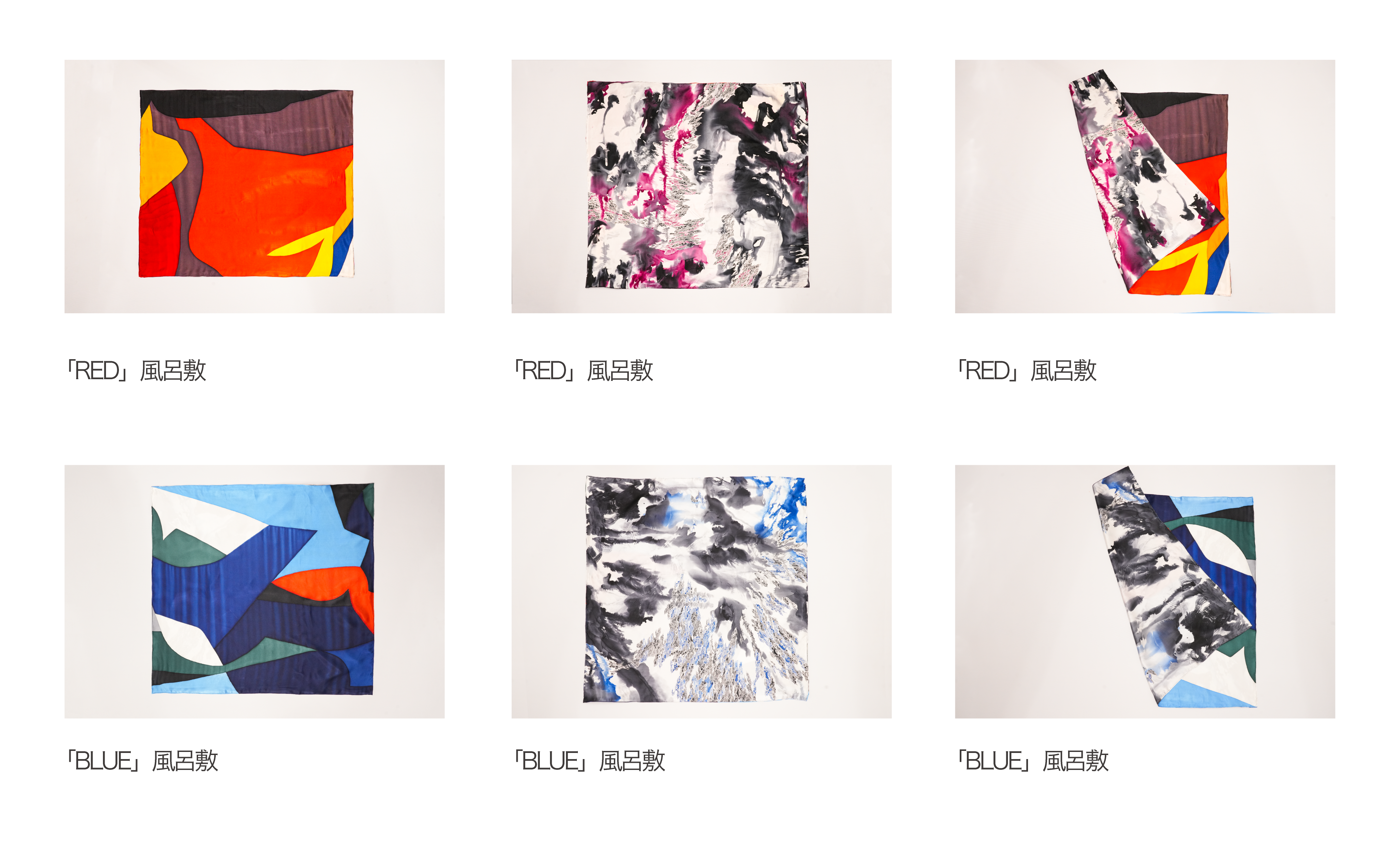 吉乃友酒造「后」の最高級ライン「RED」、「BLUE」には、町山耕太郎デザインラベルと化粧箱に加え、染色家石井佑宇馬が一点一点染め上げた、町山耕太郎と石井佑宇馬による作品がデザインされたリバーシブルの手染め友禅風呂敷が付属します(「后」の最高級ライン「RED」、「BLUE」は受注生産です)。
