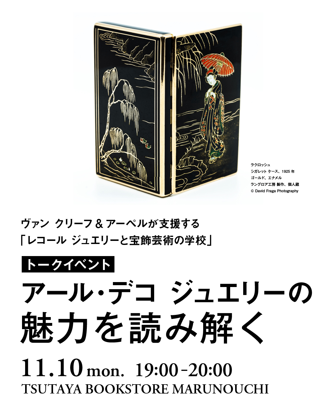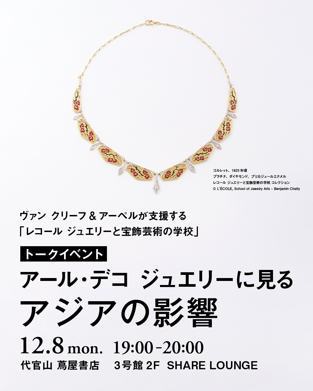 2026年1月18日まで東京都庭園美術館にて開催される展覧会「永遠なる瞬間 ヴァン クリーフ&アーペル ― ハイジュエリーが語るアール・デコ」。この特別な展覧会の開催を記念して、代官山 蔦屋書店とTSUTAYA BOOKSTORE MARUNOUCHIでは、 ヴァン クリーフ&アーペルが支援する「レコール ジュエリーと宝飾芸術の学校」によるアール・デコをテーマとしたトークイベントを2回にわたり開催いたします。アール・デコ様式の本質と、その国際的な広がりについて、専門家が貴重な作品とともに紐解きます。