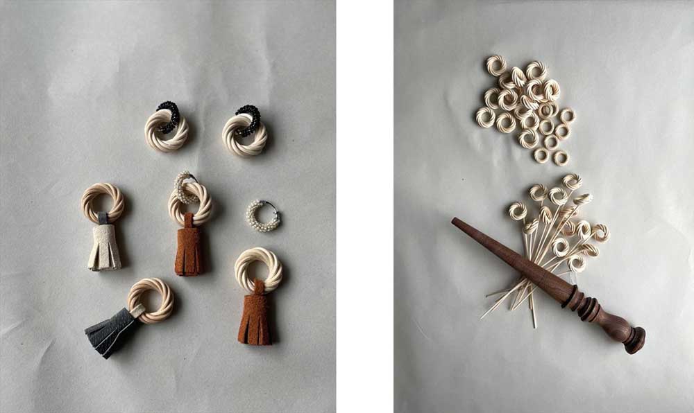 籐作家、籐と異素材を組み合わせた作品を、ひとつひとつ丁寧な手仕事を心がけ製作しています。夏のイメージが強いカゴバッグやラタンアクセサリーを、革や天然石など異素材と合わせることで通年使えるデザインに仕上げているのが特徴です。
