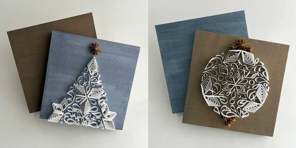 紙でできたさまざまな形のパーツを使って作る、一辺15cmの正方形シーズナルアートボード。お申込時にウッドボードのカラー(ゴールドまたはシルバー)をお選びいただき、ワークショップ当日にツリー型または、丸型のどちらかお選びいただきお好きなデザインを制作していただきます。