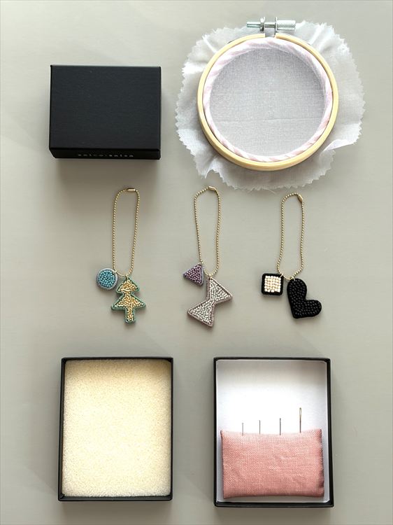 ビーズと刺繍糸を使って、オリジナルのチャームを制作します。ご用意した中からお好きなカタチを選び、枠の刺繍糸の色や中のビーズを自由に組み合わせていただけます。