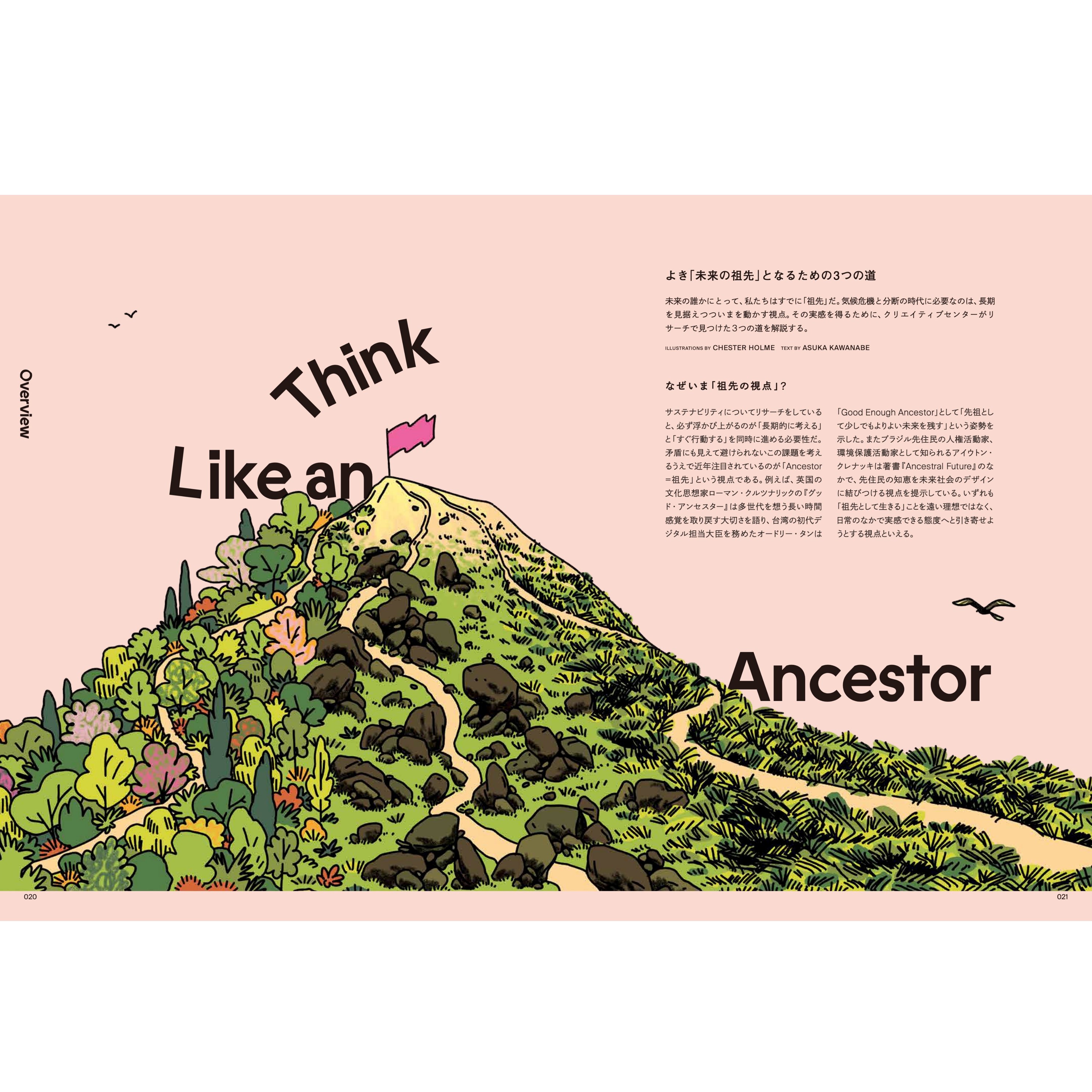 具体的には「未来の祖先として今日をどう生きるか(How to Act Today as a Future Ancestor)」という問いを起点に、サステナビリティをめぐる新たな視点を獲得し、創造的な実践を促すための「兆し」がまとめられている。