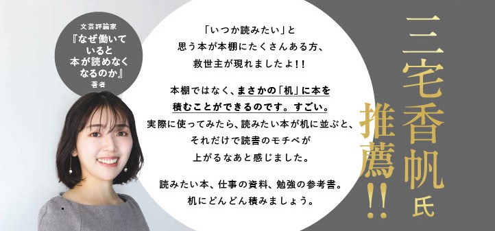 「積読ホルダー」は、創業20年目を迎えたビジネス書出版社クロスメディア・パブリッシングの中から生まれたアイデア商品です。当社は出版事業を営んでいるため尚更ではありますが、オフィスのデスク上は本だらけであることが常です。そして、気づけば積読している本が増えていき、積み上げた本はタワーの様相を呈している……。少し触ったらタワーが崩れてしまいそうで、後で読むことにして、ついには、その本を買ったこと自体も忘れてしまう……。「積読」の問題点のひとつ目は、本の上に本を無限に積んでいくため、形が崩れやすく、見た目がキレイになりにくいことです。また、一番上に積んだ本は容易に取り出せますが、本の上に本が積み重なっているため、途中の本が取り出しづらくなってしまいます。また、本の視認性もわるくなり、どんな本を積んだのか、その存在自体も忘れてしまいがちです。積読ホルダーでは、3つの棚板を設けることで、本をキレイに積むことができると共に、本が取り出しやすい構造になっています。「積読」した本を中々読み進められないのは、「いつ読むかを決めていない」という理由もあるものと思います。積読ホルダーでは、こうした問題を解決し、積読本の読書をサポートするため、「読むタイミング」を自分で決められる付属の特製マグネットをご用意しました。