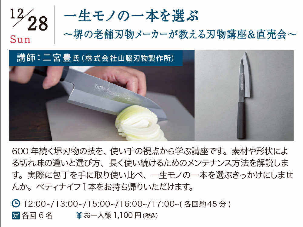 sakai kitchen 〈堺キッチン〉ブランドは、大阪・堺の優れた伝統の技をもっと多くの人に知っていただきたいという思いから立ち上がったブランドです。「道具を愛することは、くらしを愛するということ。“日々のくらしを愛する”」をブランドコンセプトに、 堺の伝統産品である刃物、 注染・和晒、 線香、またそれらの魅力を引き立て共に輝く逸品をブランド認定し、堺の伝統産業の魅力を発信しています。プロの料理人から愛される堺刃物、使うほどに風合いが増す手ぬぐいやストール、400年以上受け継がれる香り——見て、感じて、愛着をもって長く使い続けられる、お気に入りの逸品を見つけてみませんか。期間中、商品の魅力を体感できるスペシャルイベントも実施します!伝統の技との新しい出会いをぜひお楽しみください。