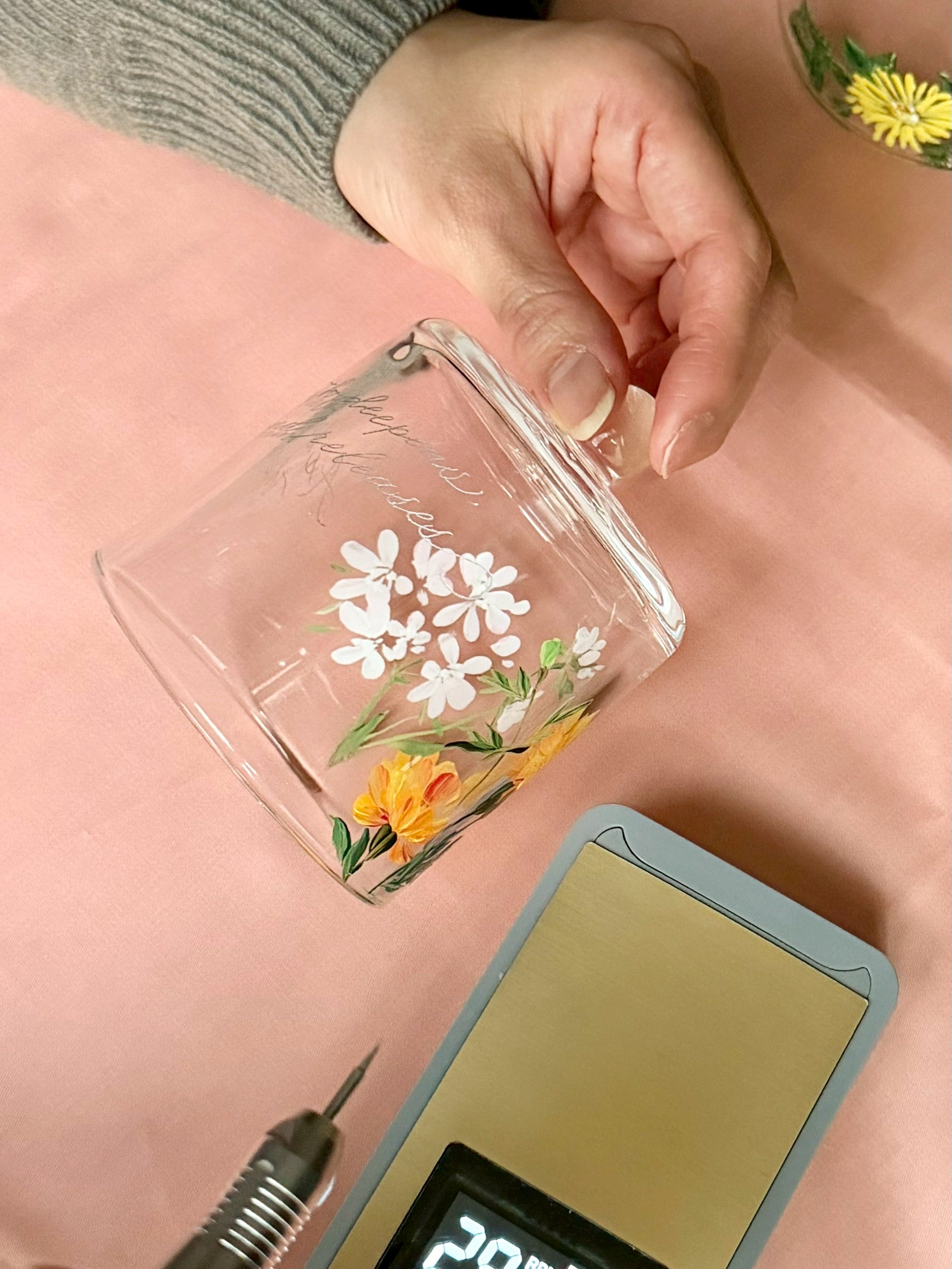 1点、1点ハンドペイントによりガラスの器に絵を施す『bottle painting』とガラスに文字を刻印する