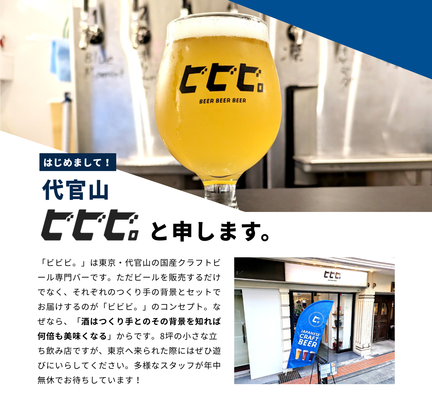 「ビビビ。」は東京・代官山の国産クラフトビール専門バーです。酒はつくり手を知ると、何倍も美味しくなる――。これが「ビビビ。」のモットーです。