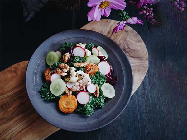 おばあちゃんの家にお遣いへ行く赤ずきん。お母さんに『寄り道はしちゃダメよ』と言われ『はーい』と返事は良かったものの、綺麗な花が咲いている場所を見つけるとそんな約束も忘れて、夢中でお花を摘むのでした。そんな赤ずきんが寄り道をした森をイメージしたサラダ。