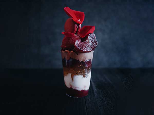 ある商人が訪れた美しい城。その城の庭で見つけた薔薇の生垣を見て、愛娘がお土産に薔薇が欲しいとねだったのを思い出し、思わず一輪摘んでしまいます。たった一輪の花が引き寄せた、ロマンス。薔薇と赤い食材を合わせて作ったデザートです。