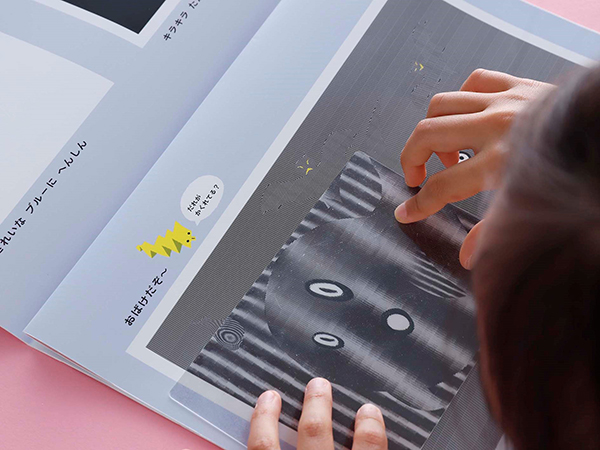 本来はシートに直接印刷されるレンチキュラー。印刷とシートを別々にしたら、そこにはとっても不思議で、綺麗で、楽しい世界が広がっていました。シートをまっすぐ当てて、そうっとゆっくり動かして、ちょっと難しい。でも、そんなことは考えなくてもいいのです。好きな模様が見えるように、好きな色が見えるところで、気持ちのいいスピードで動かしてみてください。この本を抜け出して、身の回りのあらゆるものにその魔法のシートをかざし出したきみは、もうレンチキュラーマスターだ。