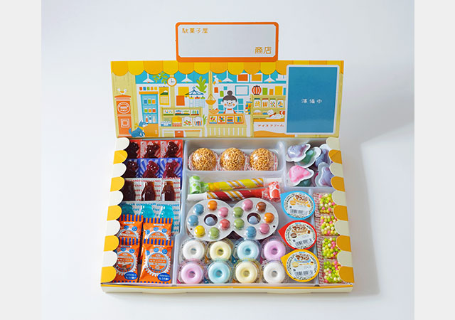 「駄菓子屋さんごっこ」ワークショップポップでカラフルな令和の駄菓子屋さん。箱を折るだけでオープンする手軽なキット「駄菓子屋さんごっこ」で、くじ引きやお金の知育を楽しみましょう。