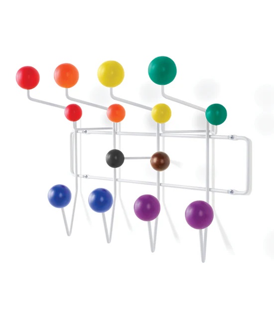 1953年に登場したイームズ ハングイットオールは、チャールズ&レイ・イームズの「享楽について真面目に考える」という信念を具現化した作品です。オリジナルはホワイトワイヤーのフレームにマルチカラーのボールが付いているデザインですが、洗練された遊び心のあるデザインはそのままに、素材やカラーのバリエーションを拡大しています。