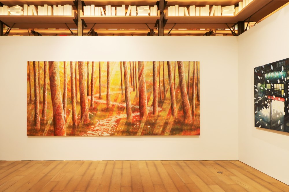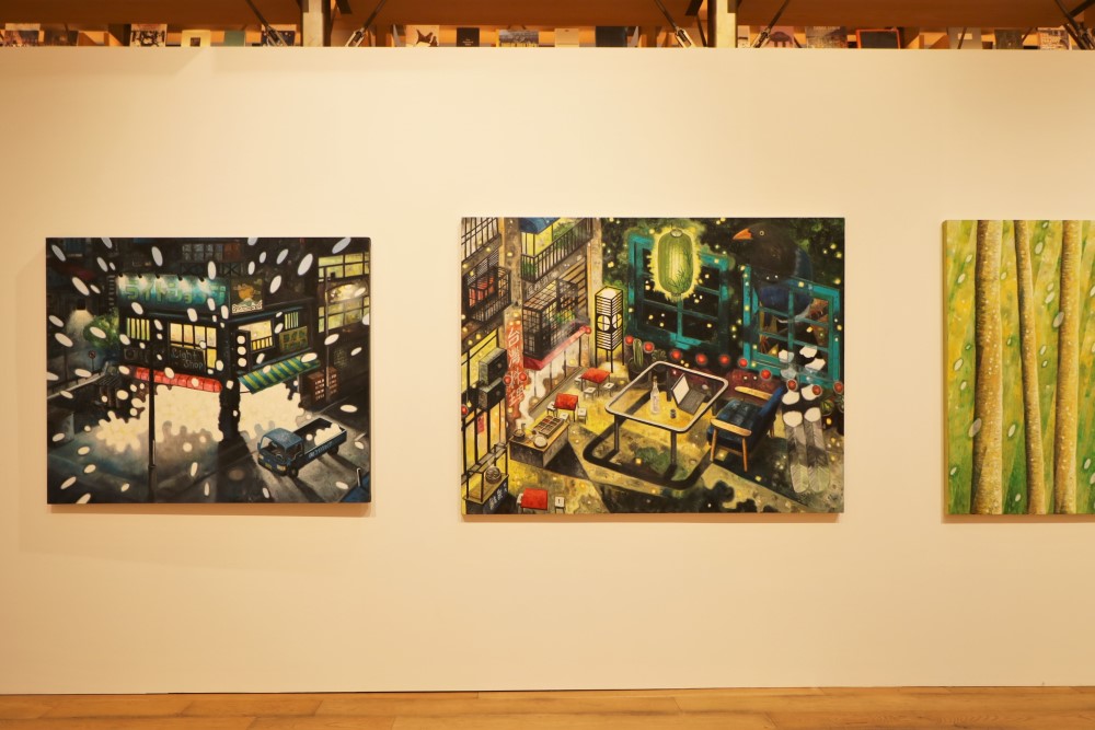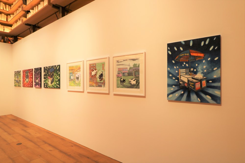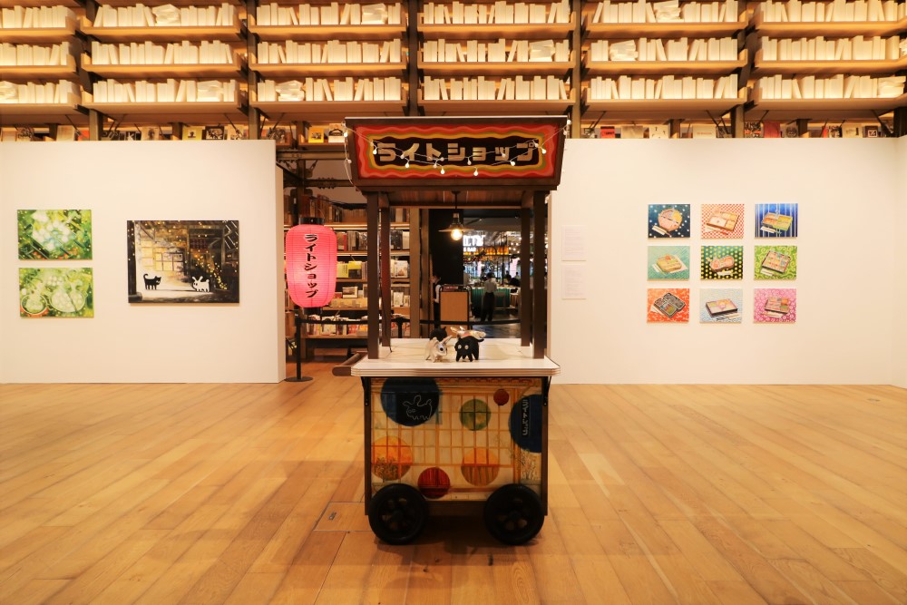 東京とニューヨークに拠点を置きながら制作活動を行う、ブラジル・サンパウロ生まれのアーティスト、大岩オスカール。それぞれの都市の環境や社会課題をテーマに風刺やユーモアを交えて描かれた、俯瞰的でダイナミックな絵画作品は高い評価を得ており、国内外の美術館にも多数作品が収蔵されている。京都 蔦屋書店での開催に続き、銀座での開催となる今回の個展では新作4点が加わり、「ライトショップ」というタイトルが示すように、光を象徴的に描いたシリーズを発表した。健康な体を作りあげるためには食べ物が重要なように、心の栄養となる「精神的な食べ物」とはどんなものか、それを提供するお店とはどんなものかという想像から温かな物語が展開された。光のもとに人々が集まる心地よい場所の象徴として、小さな「屋台」も会場に設置した。