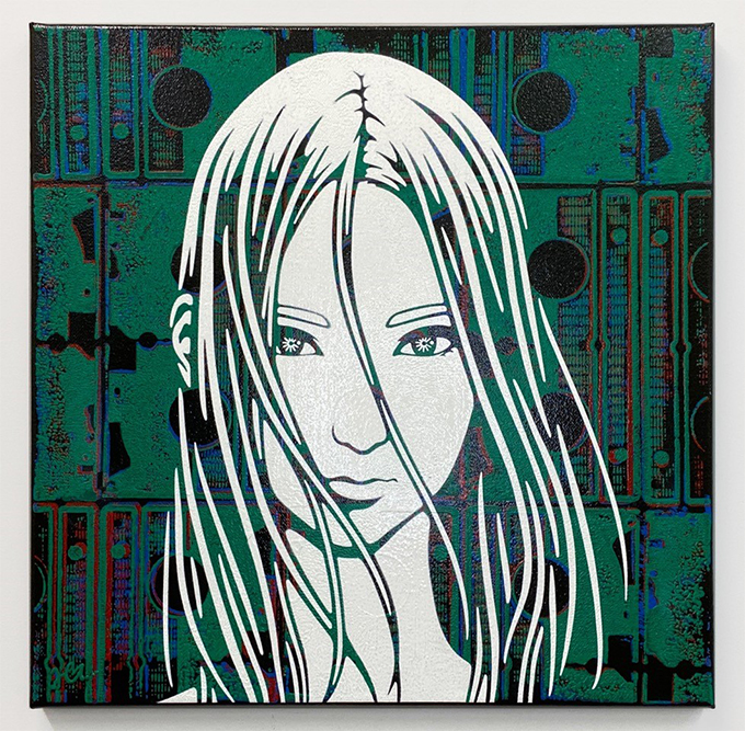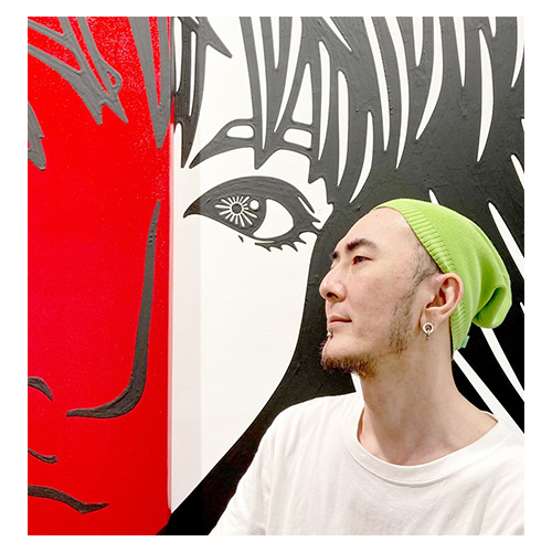 現代を映す鏡として『女性 / girl』をモチーフに漫画描写の線画にて記号化したものを描き続けている。美人画などで美を表すものとして描かれる女性像の神聖性に現代アートやカルチャーの文脈をレイヤーにしたキャンバス作品や、タブローという枠を超えた支持体としてアクリルペイントやマスキングテープ自体で描画する壁画を制作している。
