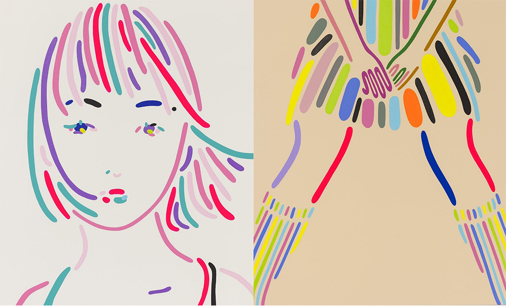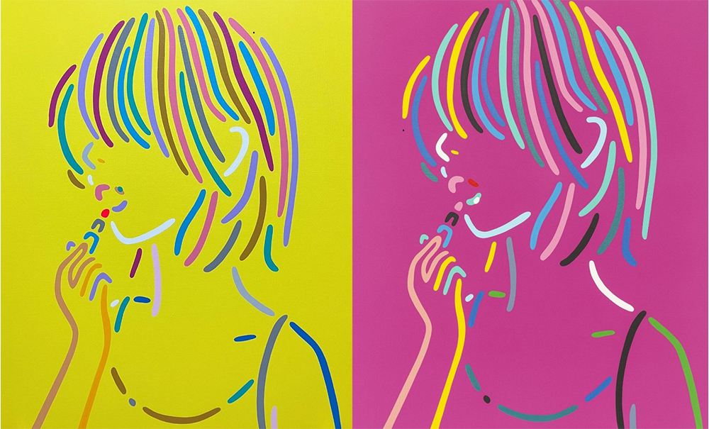 銀座 蔦屋書店では3回目の個展となる本展では、作家初の試みとして、2枚の作品を並列した1.5mを超える大型作品を発表します。特に、まったく同じ表情の女性を並べた作品は、左右のキャンバスにフリーハンドで描いた線がピタッと一致し、まるで複製された版画のようでもあります。一方で、背景や線の色のパターンを変えることで、同一人物でありながら全く別の人物のようにも見え、現代を生きる多様な女性の姿を表現しています。