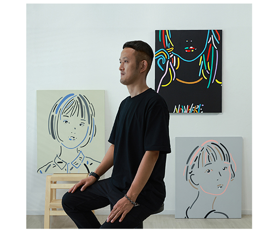 井上晋太郎は幼少の頃より培った書道の経験を基に、シンプルな線とカラフルな色を用いて描くアーティストです。主に、アクリル絵の具を使って、時代を象徴する存在としての女性像を描いたポートレートシリーズを手掛けています。