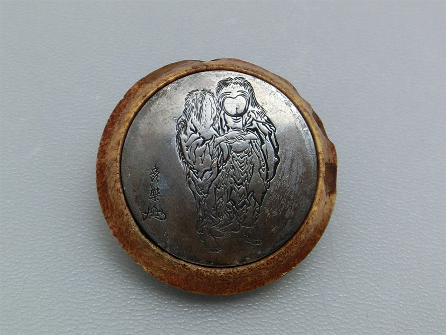 「萬福和合神時代鏡蓋根付」 銘 秀楽 四分一、鹿角 江戸後期(19世紀)