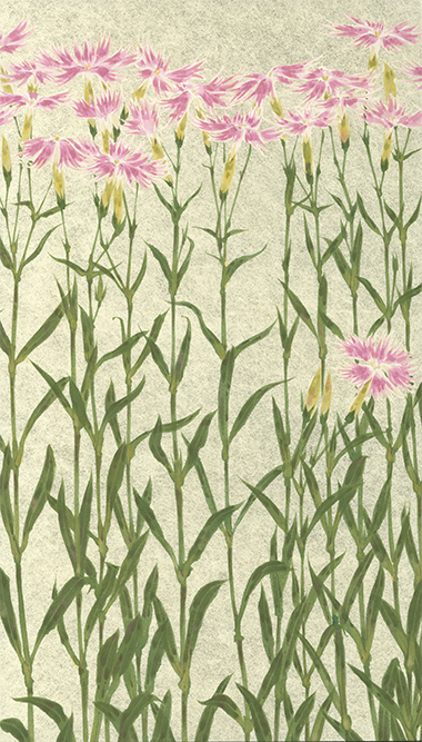 楚里勇己は、和紙に岩絵具、胡粉などの天然絵具を用いて描き、時に金箔などを効果的に取り入れる伝統的な日本画の手法で日本の四季折々の花を描き、表現しています。