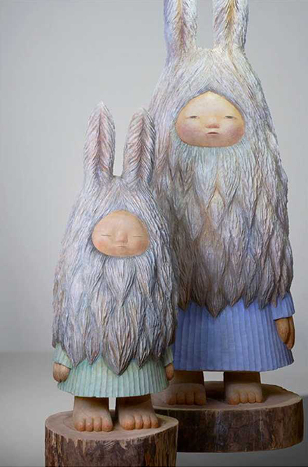 中村萌は、クスノキなどを丸太の状態から削り出し、油絵具で彩色する方法で制作を行っています。今回は、中村の作品を代表する、静かに佇む親と子の姿をイメージしたエディション作品を販売します。3Dスキャンした高精度データを用いて切削機にて縮小再現した木彫立体に、中村が自ら彫りの最終確認を行い、仕上げの彩色を施しています。