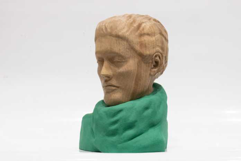 樟⽊を素材とした⼈体や⼈型、⼈と⾐服に関連する彫刻を制作している。「中性的な⼈とは何か」を起点とし、⼈の⾝体性や装飾、⼆元的な事物に着⽬し、⼈の認識を揺さぶる彫刻を思索し研究している。