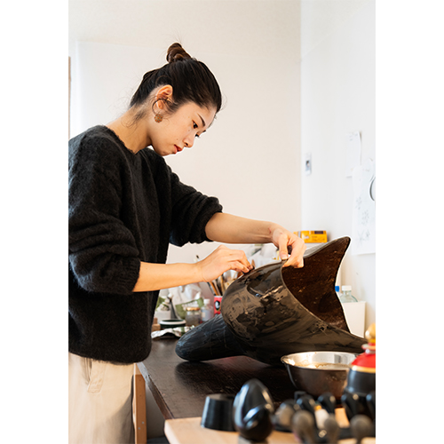 漆は時に実用の道具として人の暮らしに寄り添い、時に象徴や装飾として存在の意味を拡張してきました。私はその両義性に惹かれています。器物としての漆が「人と不可視の存在をつなぐ媒介」であるとするなら、装飾としての漆は「存在を示す装置」であると言えます。私はこの二つの側面を往来しながら、漆を記憶や存在を映し出す表現の媒体として制作しています。