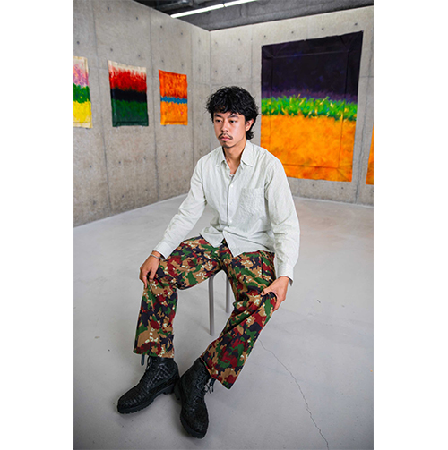 渡邉太地は、絵画を「空間をひらく装置」と捉え、「どこでも窓」というテーマのもと、抽象的な風景画を制作しています。窓というフレームを通して、目に見える景色にとどまらず、その場に漂う気配や、身体を通して感じるエネルギーまでも表現しています。