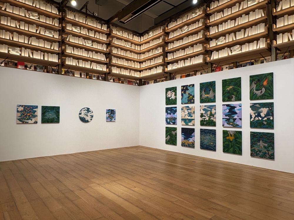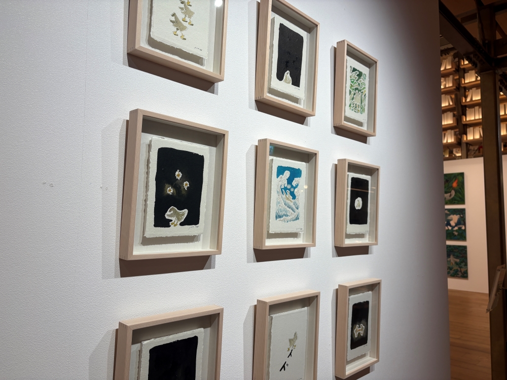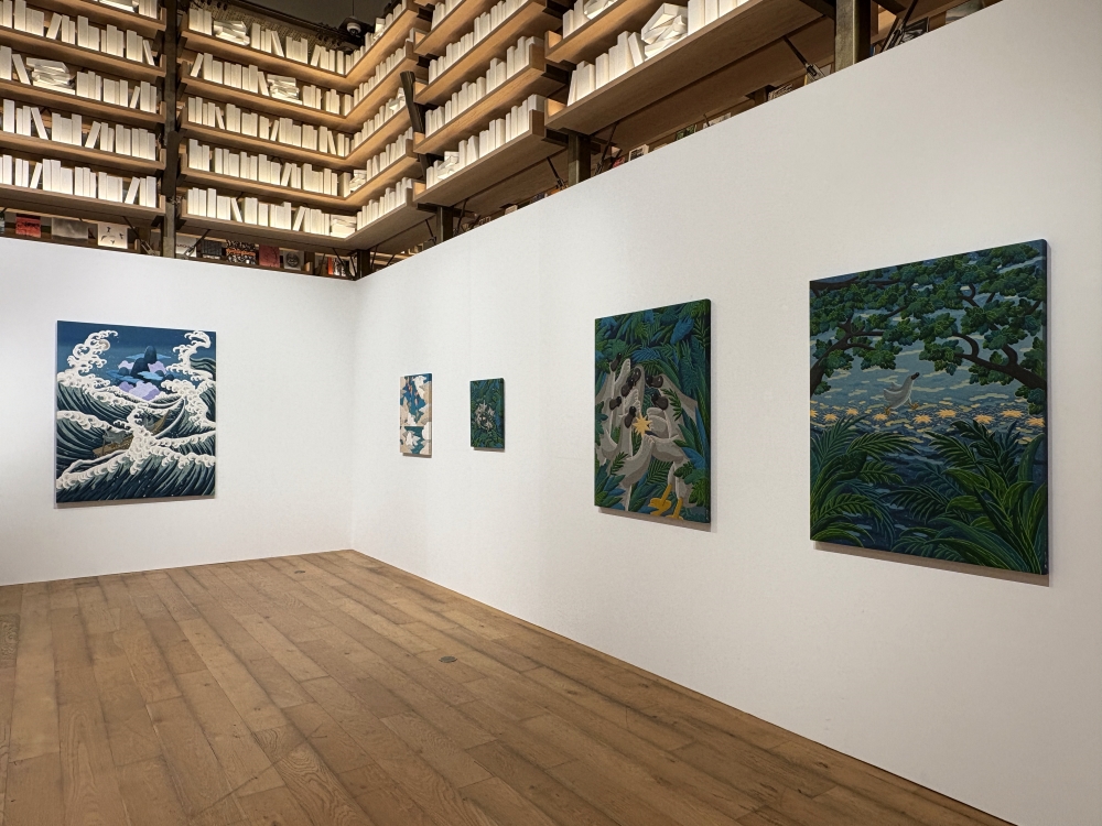 本展は、「ドードー」シリーズの歩みを振り返るオムニバス形式で構成され、新作も35点を公開、日本での展示に合わせて葛飾北斎の《神奈川沖浪裏》をオマージュした作品も発表した。この作品では、ドードーが荒れ狂う波の上で揺れる帆柱につかまりながらひたむきに航海を続ける姿が描かれた。これは、作家自身とドードーがこれからも旅を続けていく決意を象徴すると同時に、波に揺られながらも自分の人生を懸命に生きる私たち自身の姿とも重なる。“たとえ先の見えない航海であっても、希望を捨てずにしなやかに前を向いて進んでいく”という作家の願いが込められた作品の数々を展開した。