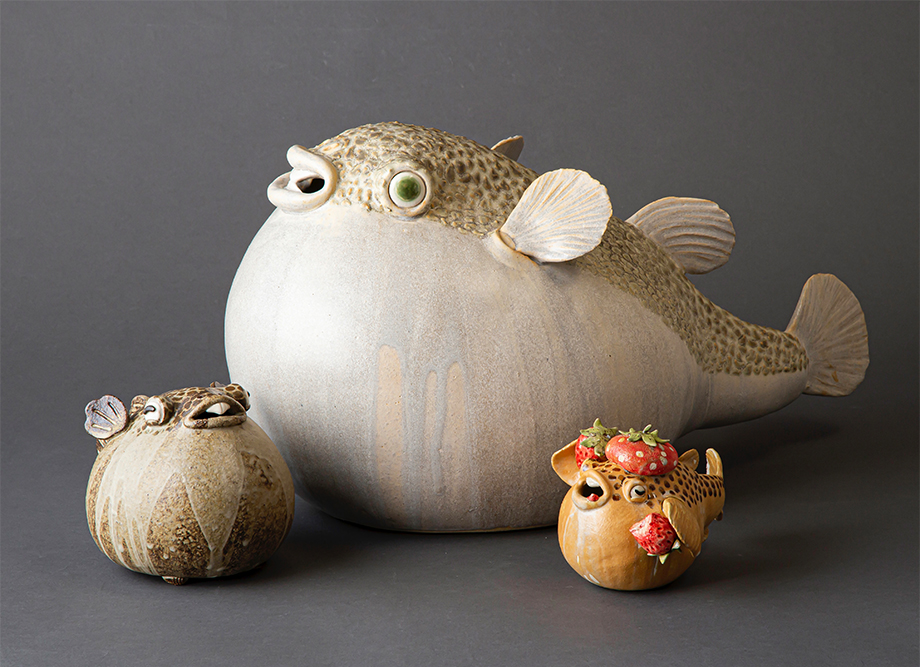 右:「いちご狩りを楽しむわんぱくな河豚」サイズ:H110×W140×D180mm、陶土、2024年