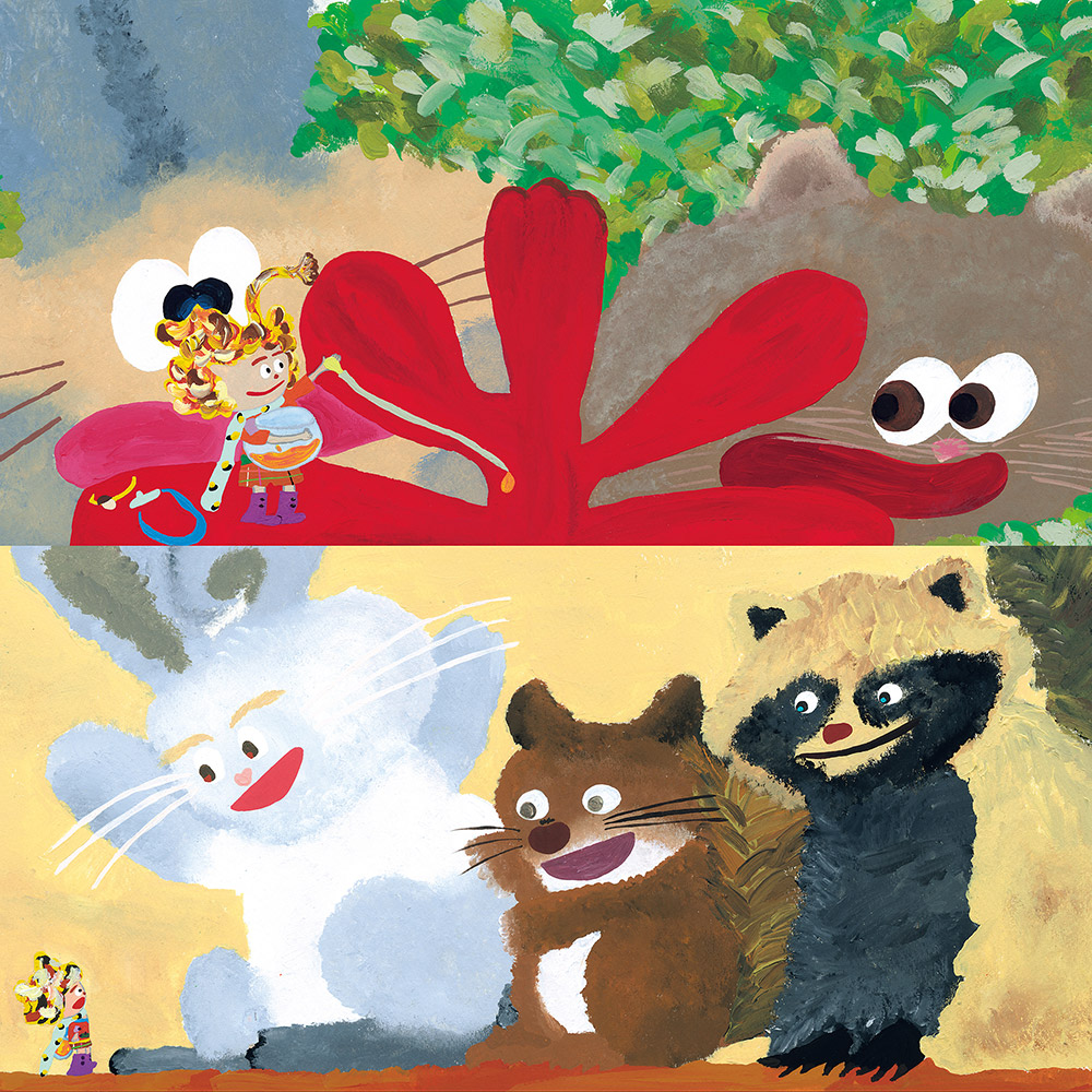 もみじの落ち葉から生まれた“こびと”リリア。サルビアの花を求めて、チョウの後をついていったところ、仲間とはぐれてしまいます。初めて訪れた花畑でサルビアの花から蜜を集めていたリリアに、タカが襲いかかります。しかし危機一髪、モモンガが現れ、リリアを助けました。モモンガの背中につかまり滑空していくリリア。モモンガが飛んでいった先は森の中。大樹の中に彼らの隠れ家がありました。そこは傷ついた動物たちが手当を受ける診療所だったのです──。