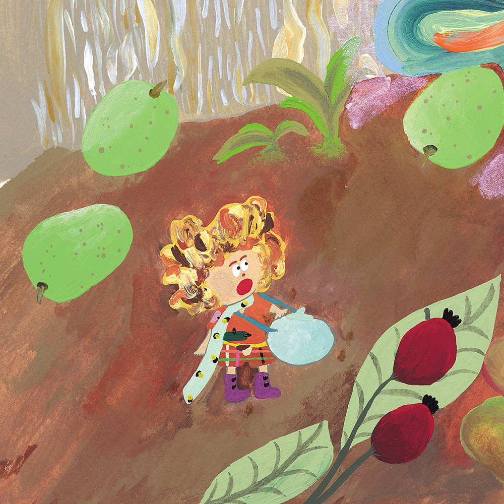 もみじの落ち葉から生まれた“こびと”リリア。好奇心旺盛だけど、少しのんびりした性格。サルビアの花の蜜を集めて暮らしている。ふわふわの髪の毛に秘密がある!?