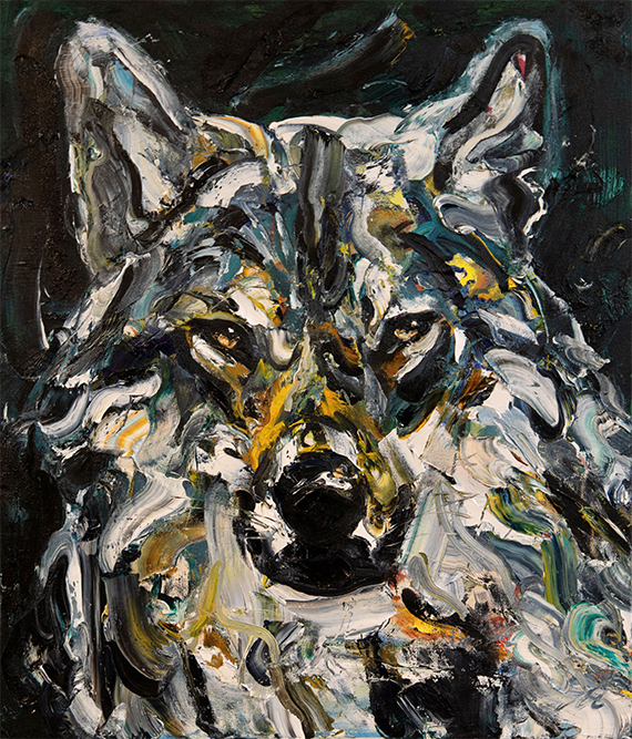 キャンバス上で勢いよく混ざり合う絵の具はエネルギーを纏いながら対象の動物を浮かび上がらせ、そして瞳には希望を表すハイライトが際立つ。