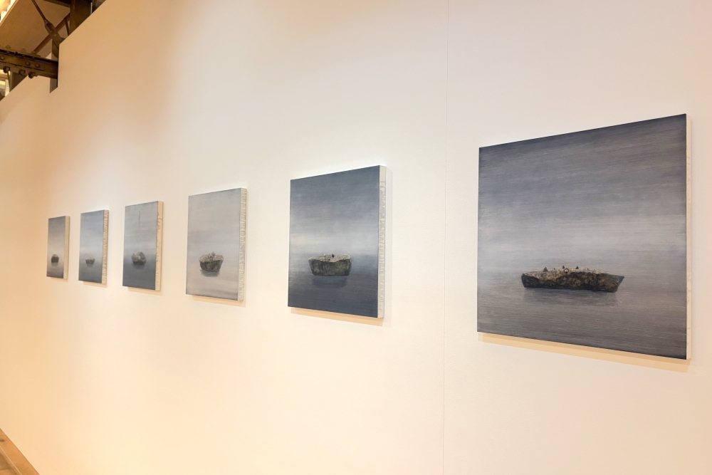 地球上のどこかに行けば見られるかもしれないが、現実を超越したようでもある壮大な自然と、その中に見えないほどに小さく存在する裸の女性。シュールなようでリアルでもあり、夢の中に入り込んだような独特の世界が枝の作品の特徴である。本展では新作を4点展示するほか、枝の世界感を立体にしたインスタレーション作品も含めて30点以上を展示した。
