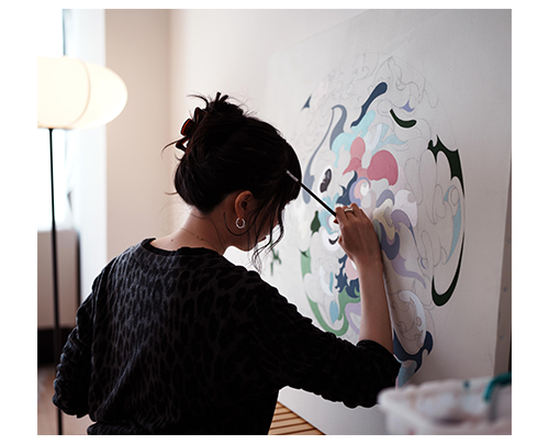 なかでも、彼女の代表的な作品群《Wonky Mandalaシリーズ》は、自然界の神秘を讃える独自の“宇宙観”を、キャラクターのパーツや有機的なパターンを通して表現したものであり、形とリズムの普遍的な言語として可視化し、それによって、あらゆる生命が持つ深層での調和とつながりを象徴的に描き出しています。