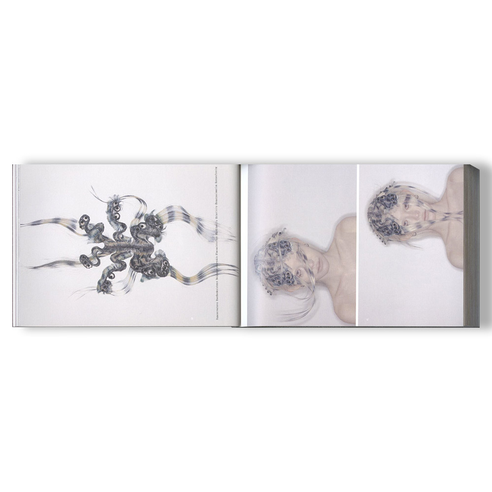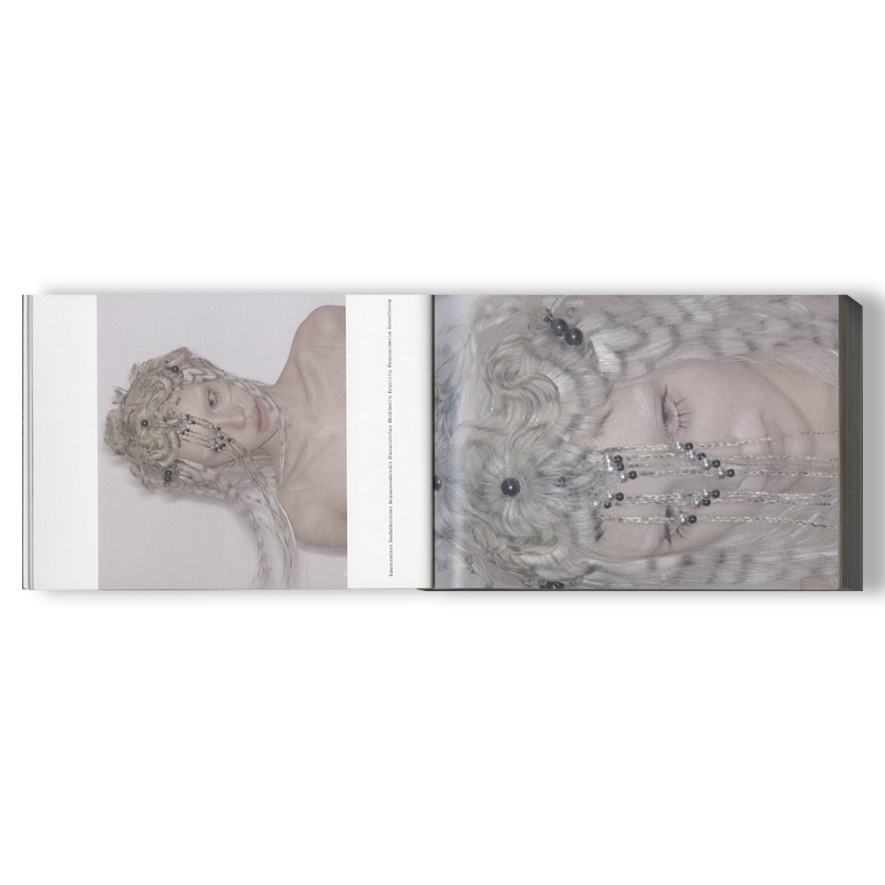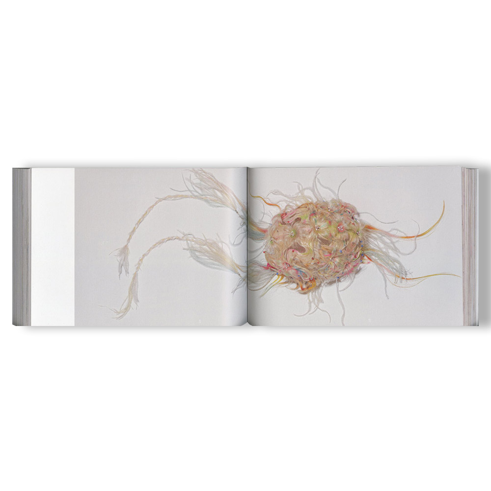 Through human hair—an intensely human material—it explores forms that resemble unfamiliar organisms, specimens, or cosmic beings, producing a sense of drift between self and other, nature and artifice, body and signal. It's a 368 page book with a sequence of face in various wigs inspired by organism forms.