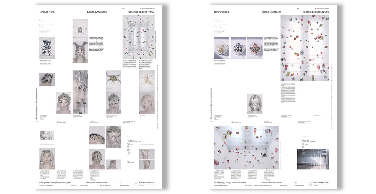 ウィッグアーティストの河野富広、そしてヴィジュアルアーティストの丸山サヤカによる最新作品集『Space Creatures』。2022年から2025年までに制作した河野によるクリーチャー・ウィッグ(生物形態に着想を得た様々なウィッグ)シリーズを、丸山が撮影及びブックデザインし、さらに彼女によるイラストレーションも加えた、全368ページに渡る一冊です。