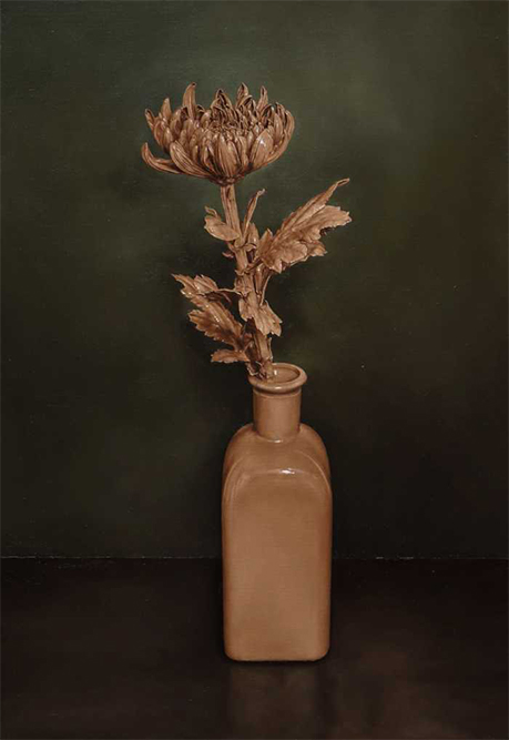 花を塗装して、フィギュアに見立てる。“リビング・フィギュア”と名付けたこのシリーズですが、塗料がなぞった形は、死を内包した生の痕跡のように感じられます。虚と実、そして生と死に対する私の認識を、花はただ不確かなものとして、ただ形として示しているように思えました。