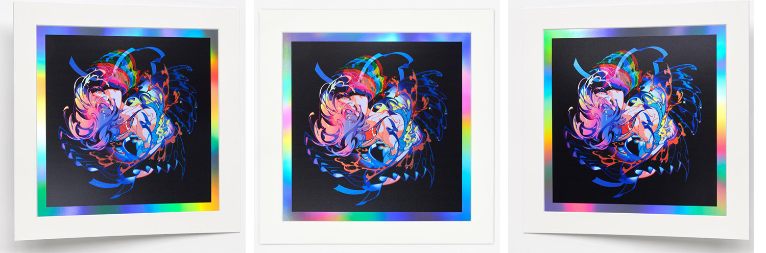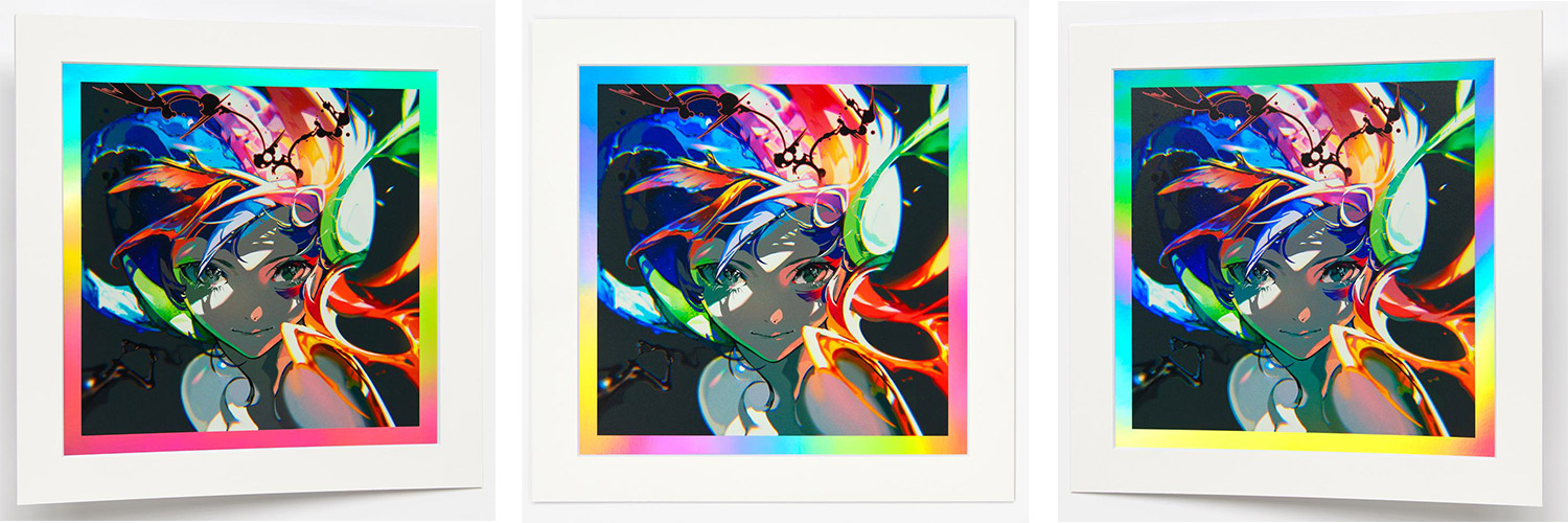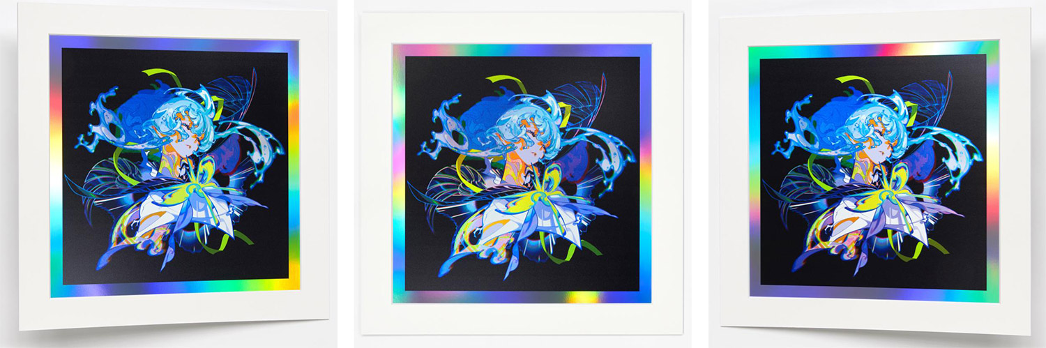 銀色やホログラムの光沢がある用紙に、高精細プリンターを使用して制作。光の強弱が生まれることによって、作品の美しさを際立たせています。大日本印刷(DNP)の印刷技術を活用したアートポスターです。