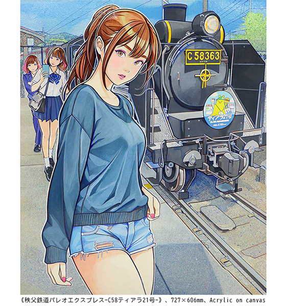 過去にアルバイトを通じて出会った“ギャル”文化に影響を受けて以来、日本のアニメ、漫画、ゲームなどのオタクカルチャーを背景に、「盛る」「デコる」「萌え」といった要素を独自に昇華し、キラキラとした質感と繊細で細部までこだわりぬく筆致で「カワイイ」女の子を描いてきました。白いアウトラインで縁取られ、二次元的で非現実的な可愛さをまとった少女像と、背景に描いた、作家が実際に見た街の風景、親しみのあるキャラクターやアイコンによって、虚構と現実が交錯する独自の世界観を表現しています。