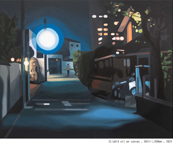鈴木雅明は愛知を拠点に、都市や郊外の「夜景」を描いたシリーズや、暗室で限られた光源に照らされた机上の針金や球体といった静物を描いた「机上の光」シリーズなどを手掛ける作家です。鈴木の作品には一貫して「人工の光」が登場し、その光がどこか懐かしさを感じさせるようでもあります。また、光を単なる視覚的現象にとどめず、ひとつの概念として捉え直し、それを取り巻く環境や意味を模索しています。さまざまな変遷を辿りながら20年以上描き続けてきた「夜景」シリーズ。近年は特に「見えない」ものにフォーカスを当て、デフォルメ、筆のタッチ、構図、視点などをより多角的に意識して描いています。