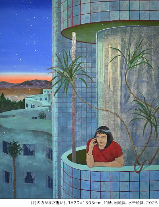 2025年春から初夏にかけて韓国で滞在制作を行った荒井は、自然と人工物、無機質な建築と有機的な曲線など、異なる要素を組み合わせる自身の特徴を、より意識的に探究しました。また、初めての海外生活を通じて言語的距離が人との関係に影響を与えた経験から、これまでバストアップが中心だった人物表現が全体像を描くように変化しています。一方で、作品の根底にあるテーマは揺るがず、一貫して映画や小説の中のようなどこか遠くにある世界の物語を描いています。今ここにある世界が、自分自身のことも含めて何一つ確信できるものでは構成されていないと考え、同時に遠くの世界の存在に希望を見出し作品上に表現しています。