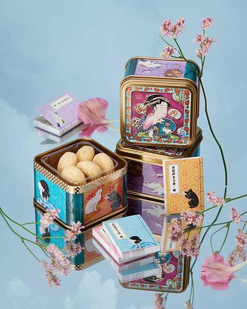 グルテンフリーやプラントベースのヘルシースイーツにこだわるスイーツブランド。今回の蔦屋書店限定品は、ステンドグラスのように輝くガラス絵×浮世絵の「お江戸ネコ缶」。グルテンフリーのきなこクッキー5枚入り。「豆本型ふせん お江戸ネコ本」の特典付きです。 -