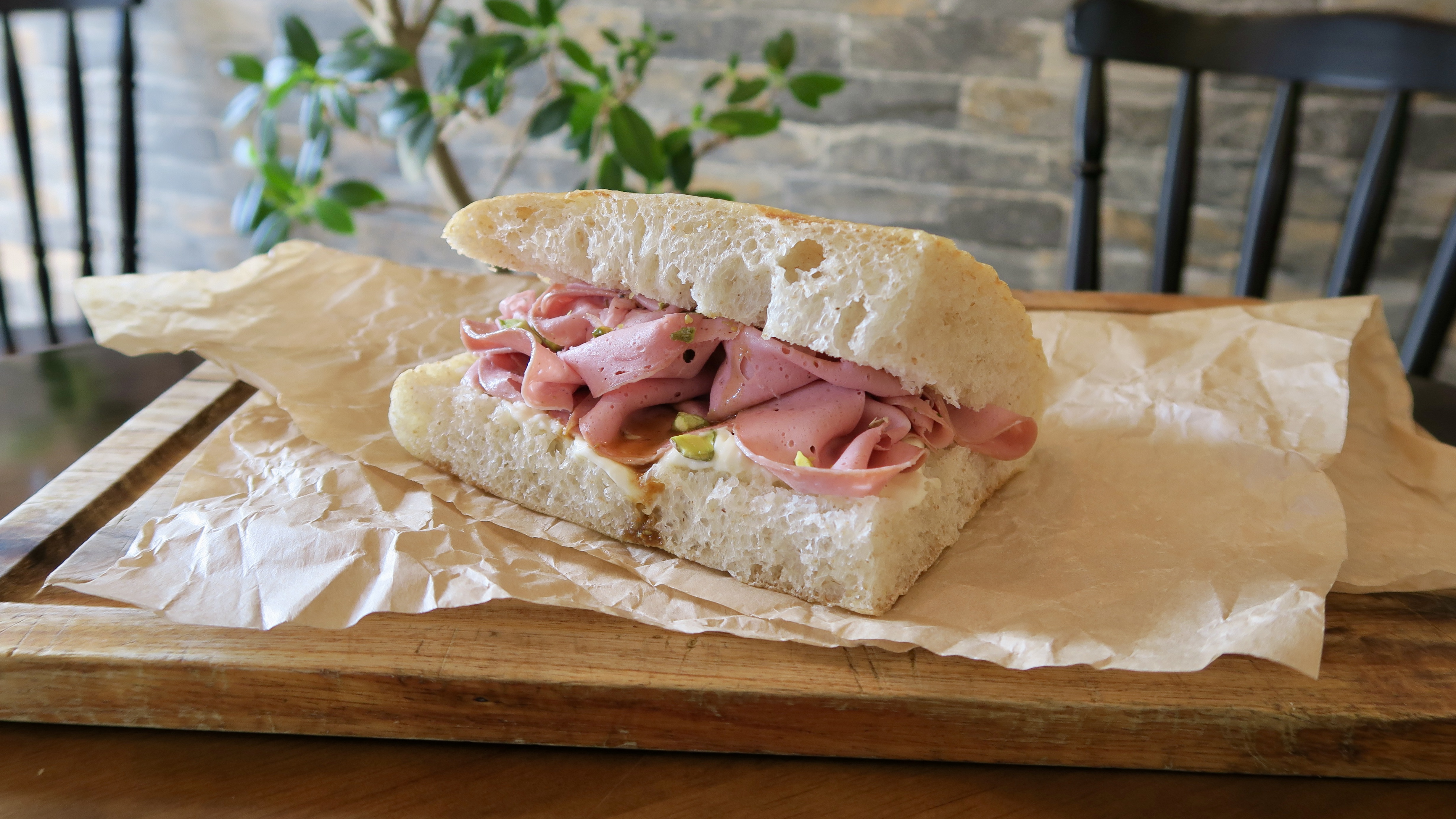 フォカッチャ:不動の⼈気ナンバーワン商品!ふかふかのフォカッチャに、ハムとチーズソース、⾹り⾼い⾃家製ピスタチオソースをたっぷりとトッピングしました。