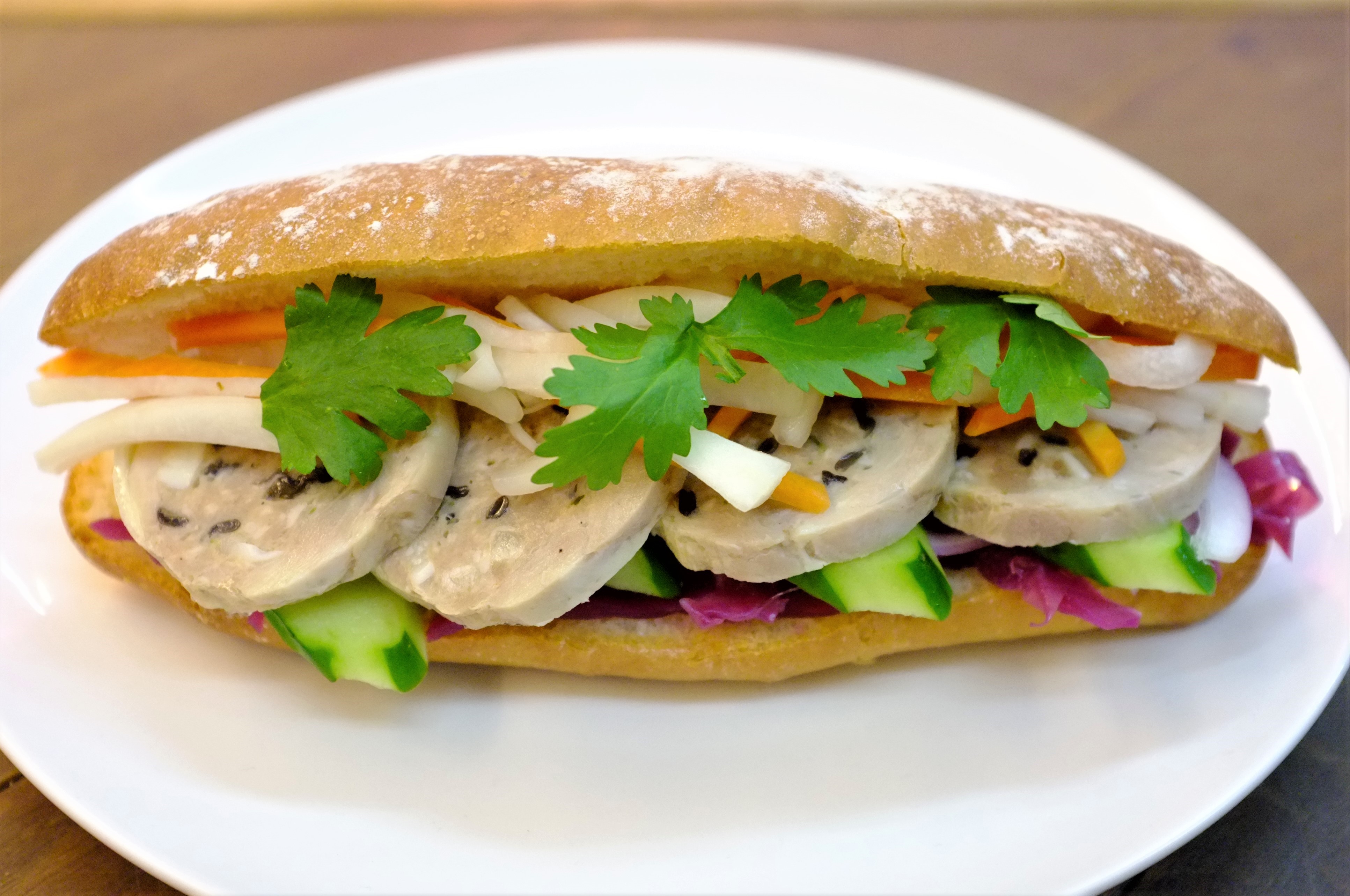 オリジナルバインミー:ベトナム風ハムをアレンジしたオリジナルのハムのサンドイッチ。豚耳とキクラゲの食感がアクセント、レバーペーストのなますの酸味でエスニックな味わいをお楽しみください。