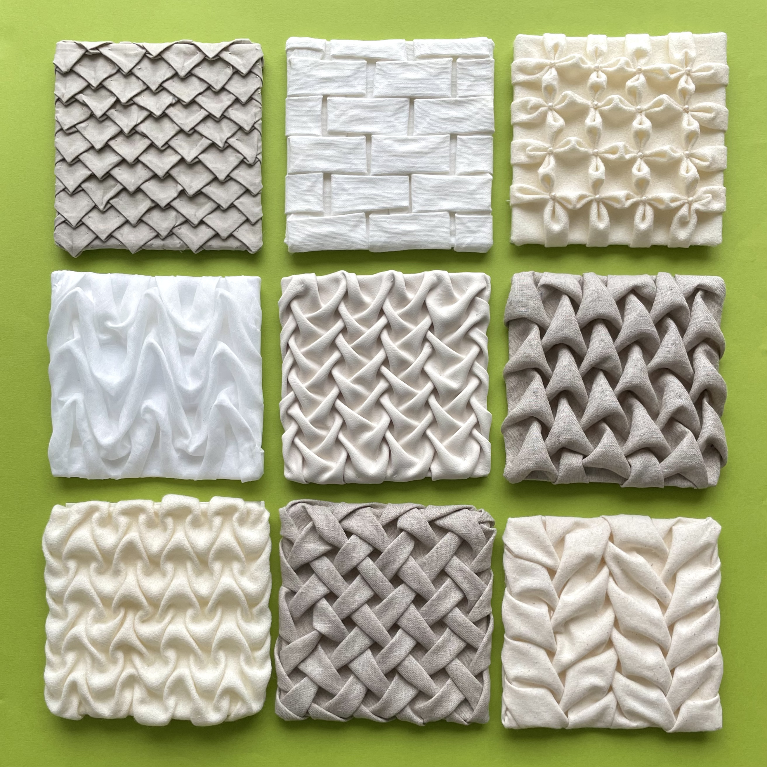 ラティススモッキングとは布を裏から縫い縮めて表に柄を出す手法。