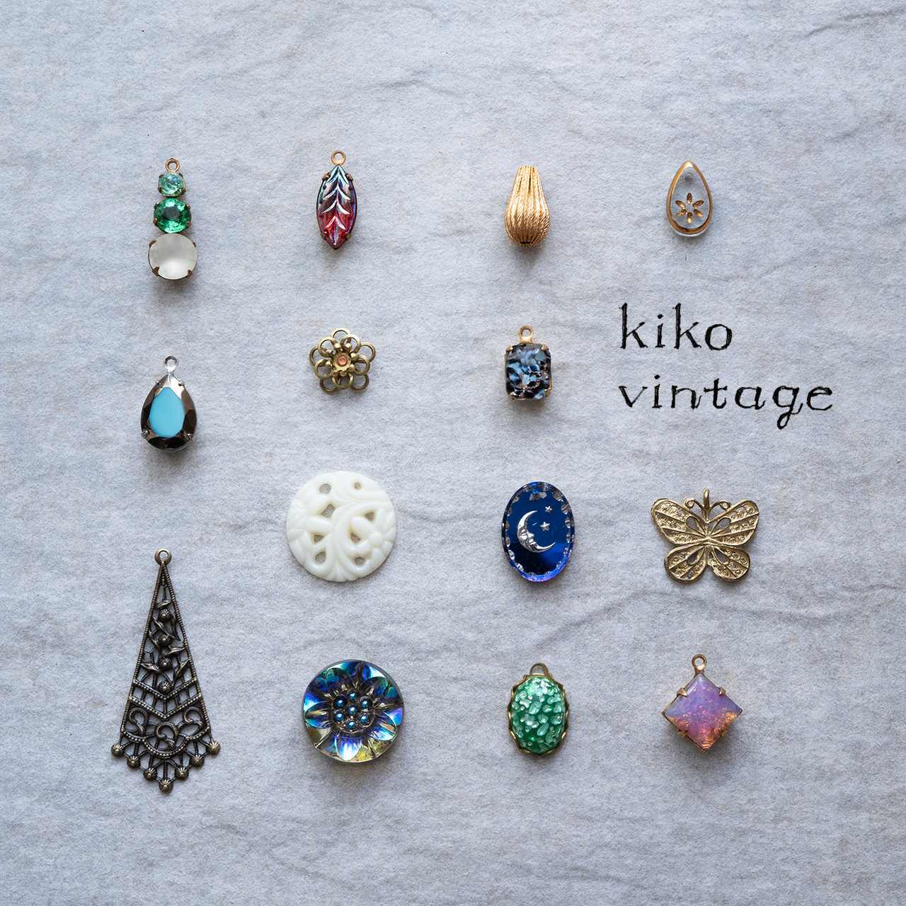 ヨーロッパのヴィンテージガラスストーンをはじめアクセサリーパーツを販売しています。直接ヨーロッパで買い付けたストーンをひとつひとつ手作業で真鍮枠にセッティングしたチャームや素朴な真鍮パーツ、珍しいカボションやインタリオなどアクセサリー制作にアクセントを加えていただけるパーツを取り揃えています。 オンライン販売と神戸に小さなアトリエショップがございます。