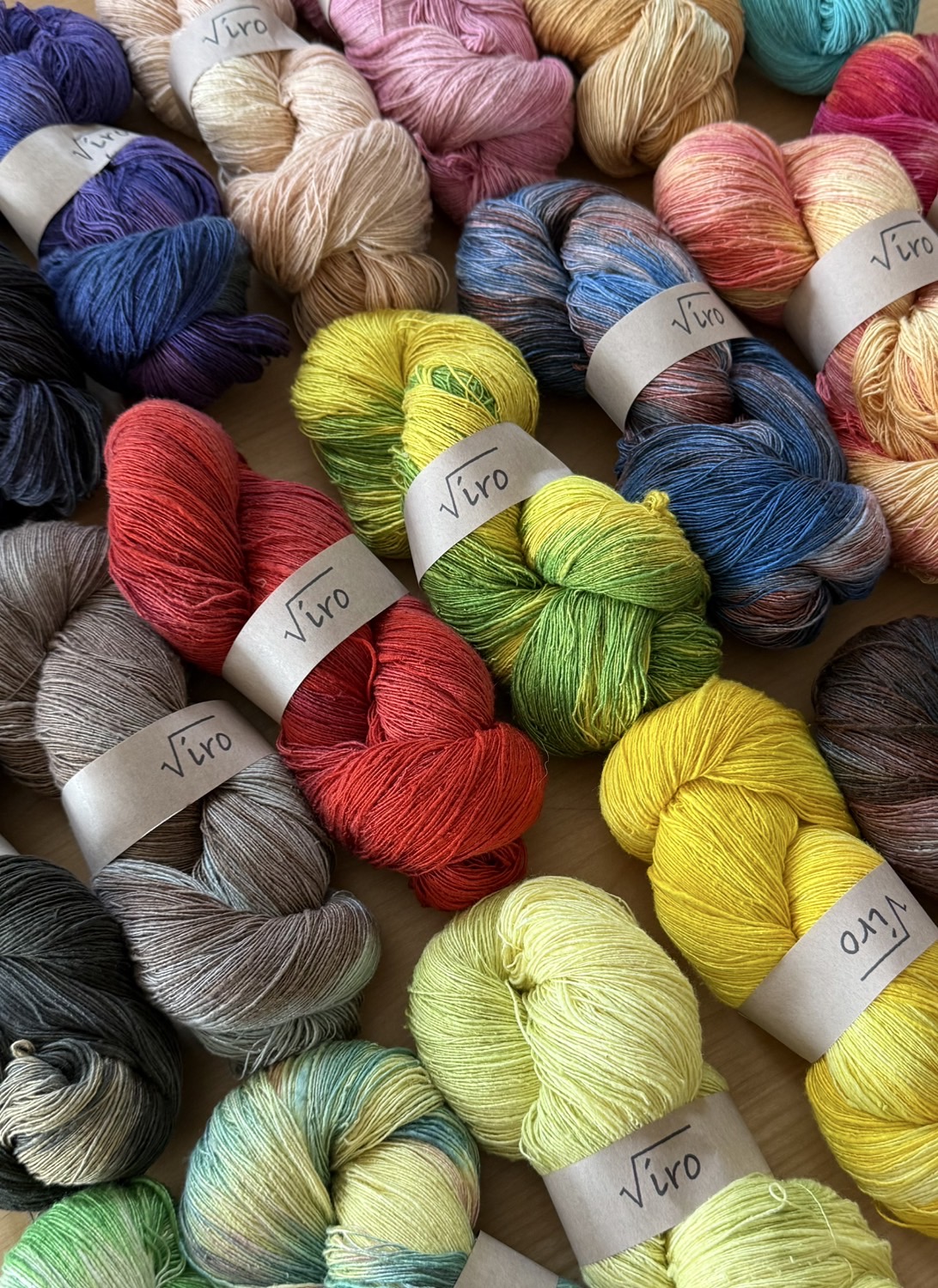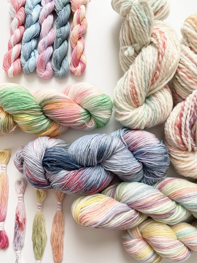 染めたり紡いだりして、「糸」を作っています。彩り豊かな手染め糸は、レース糸、刺し子糸、刺しゅう糸、ソックヤーンを。ふんわりかわいい手紡ぎ糸は、編みやすいシンプルなタイプから、飾るだけでも楽しいアートヤーンまで、さまざまな糸をご用意いたします。
