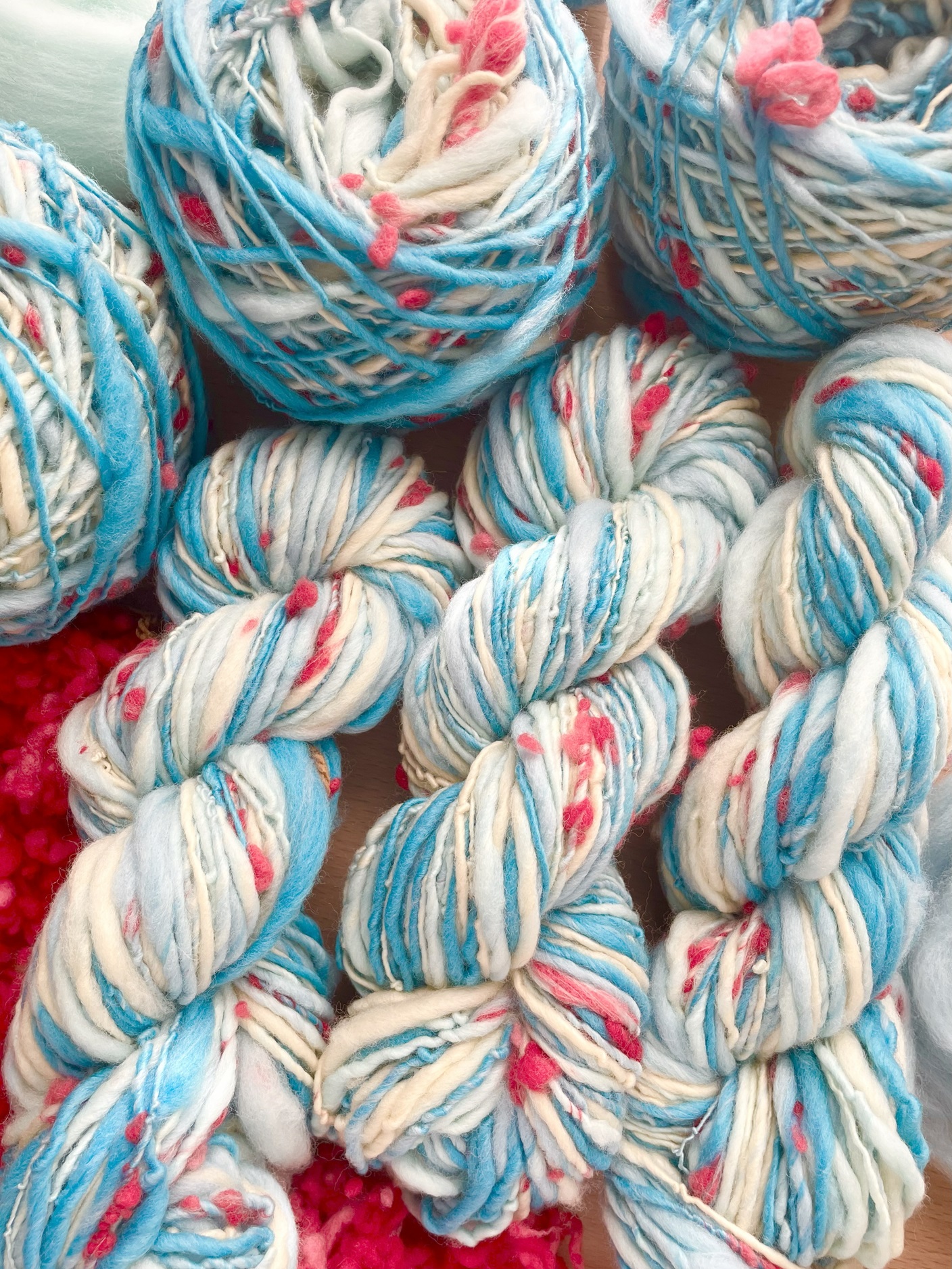 糸車で1玉ずつ手作りした毛糸です。手紡ぎだからこそできるオリジナリティーあふれた色味でご好評いただいています。