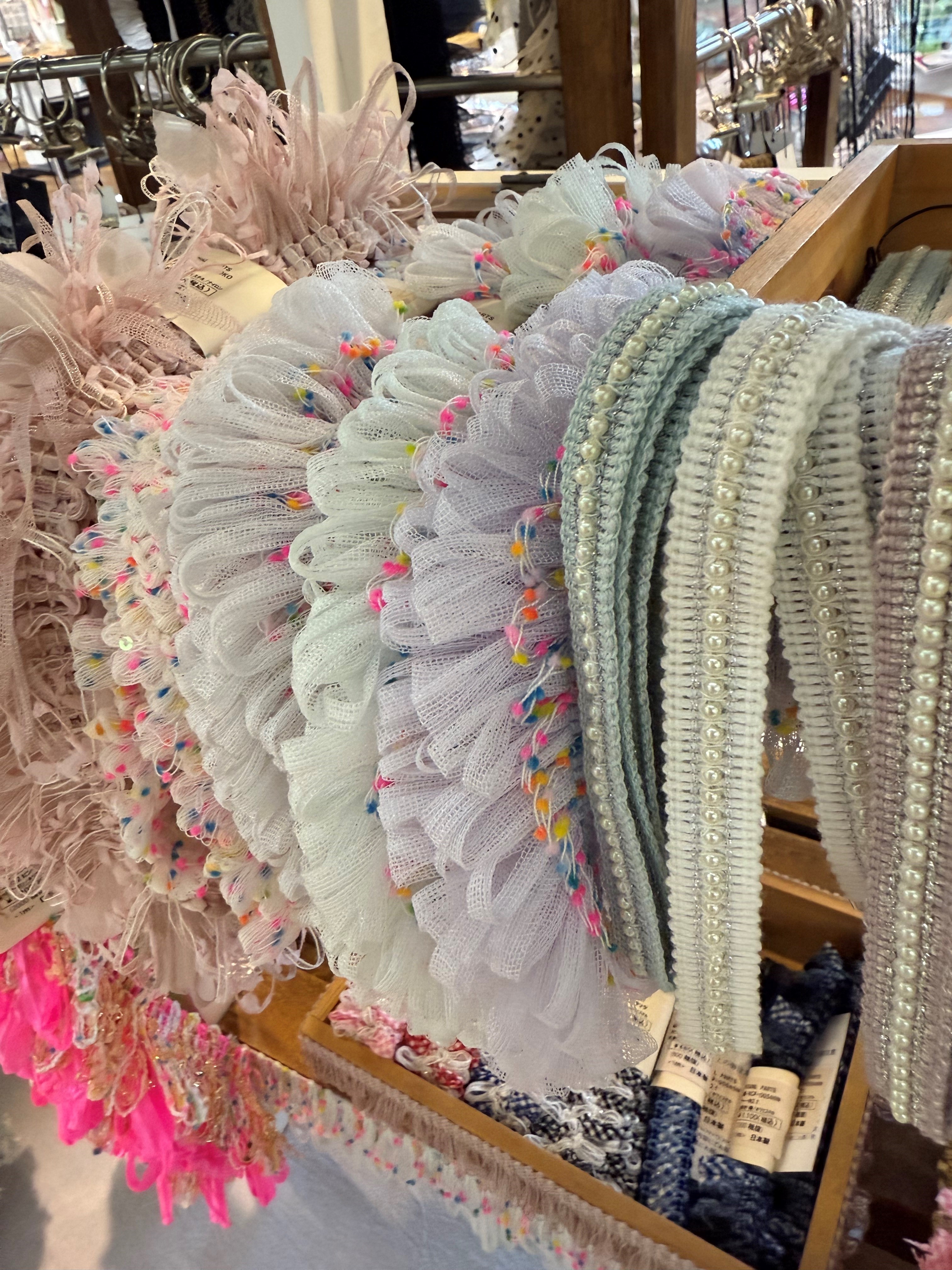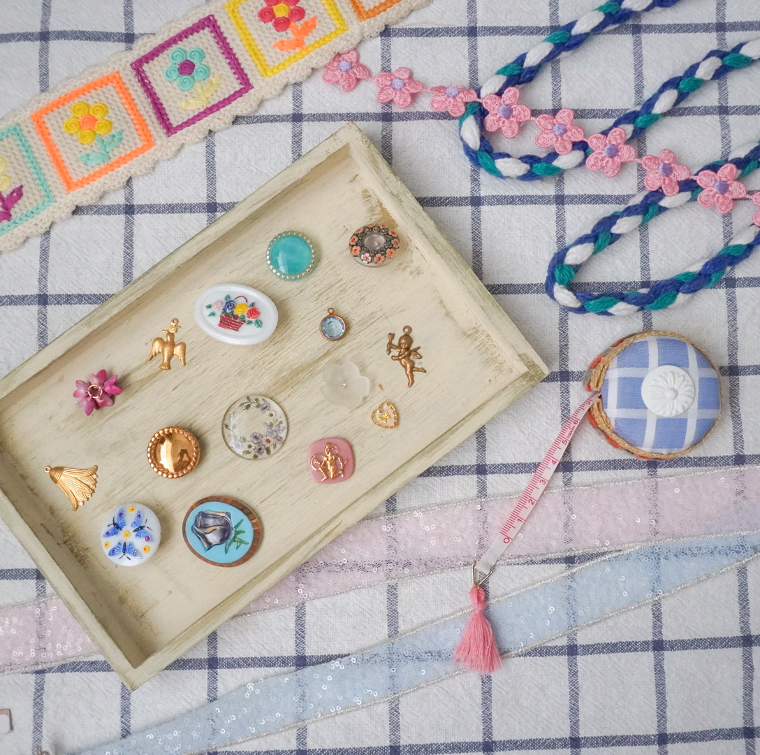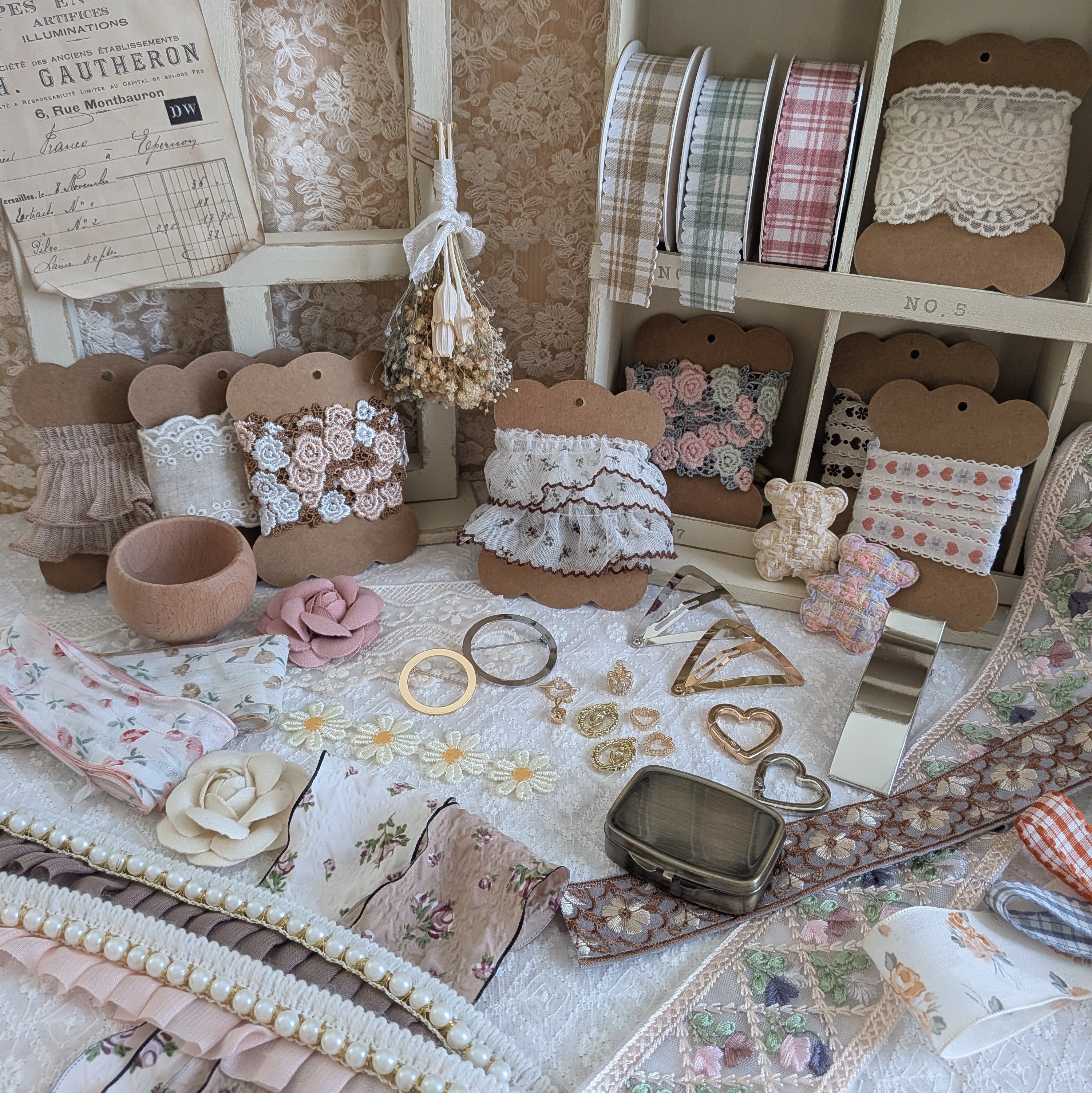 オリジナルでデザインしたレース、生地。今は廃盤になったデッドストックのボタン。インドより直輸入したリボン、刺繍生地を取り扱っています。