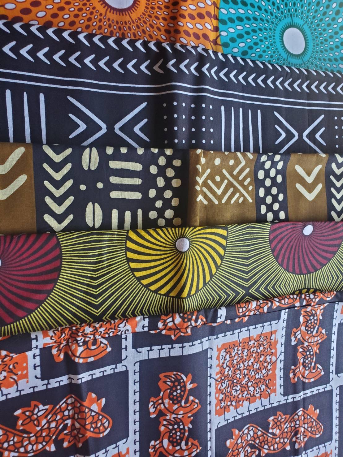 アフリカの色使い、柄が際立つ布を50CMからカットして提供します。 袋詰めのハギレ(コースターサイズなど)を提供する予定です。