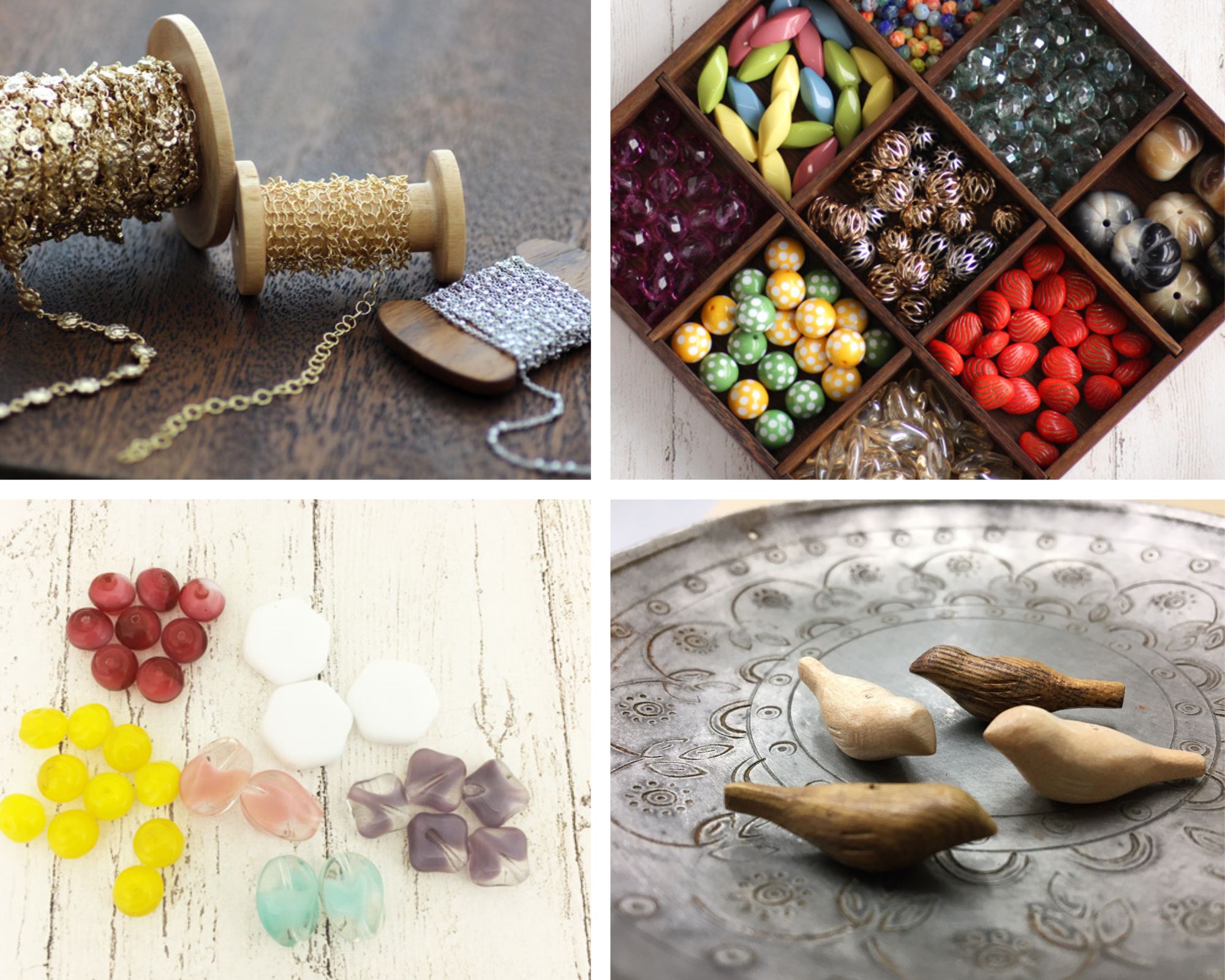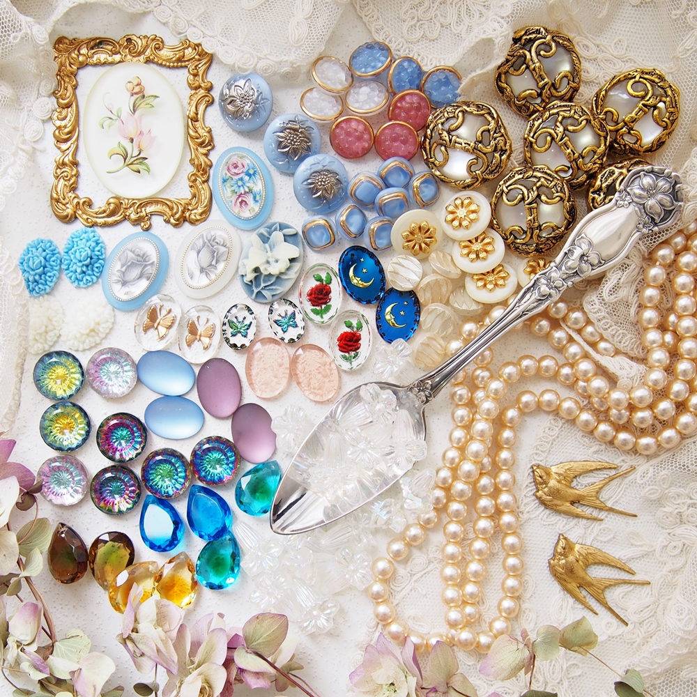 ビーズやボタンなどの手芸素材の他、海外から仕入れたヴィンテージアクセサリーパーツまで。